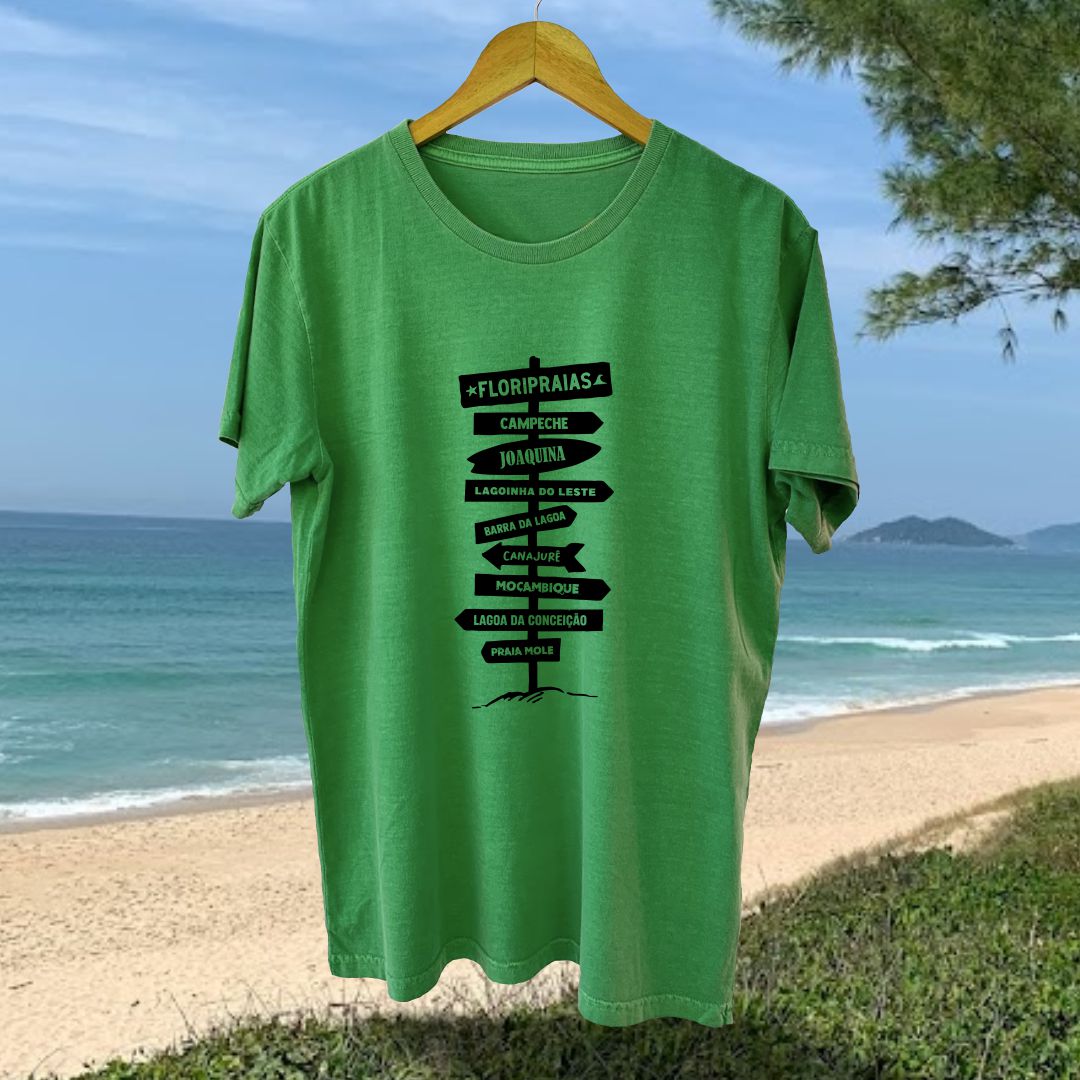 Camiseta verde estonada, meia malha fio 30.1 penteado, acabamento com ombro a ombro, estampa frontal em 1 cor.