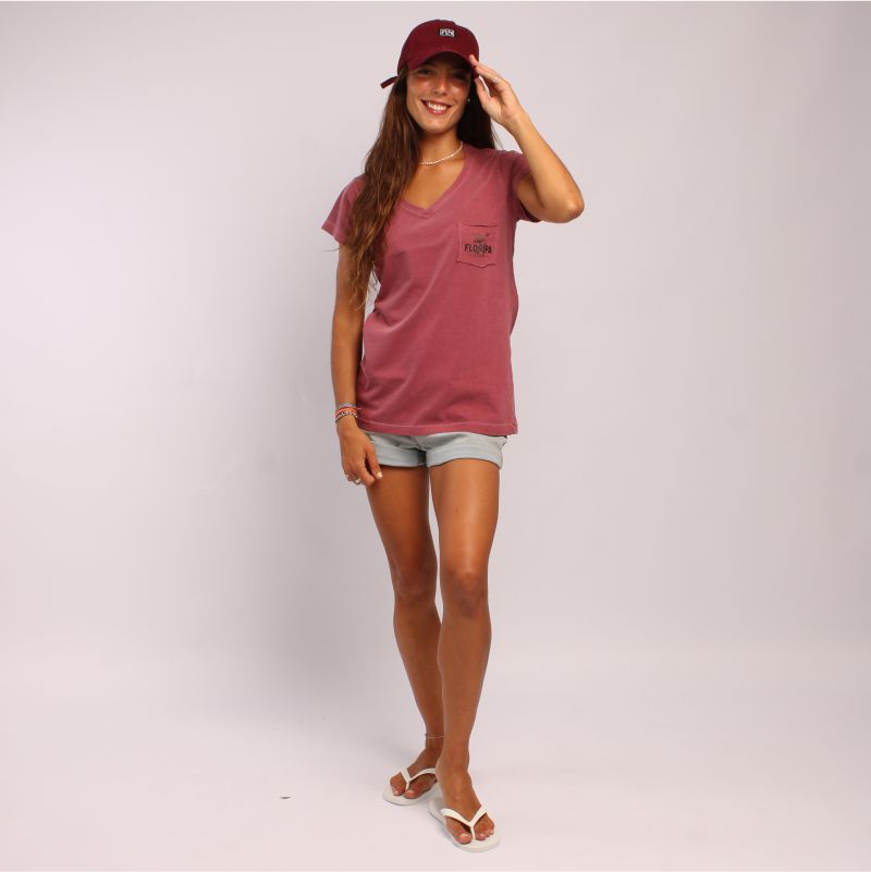 Blusa feminina gola V, 100% algodão, modelagem ajustada ao corpo, com bolso.