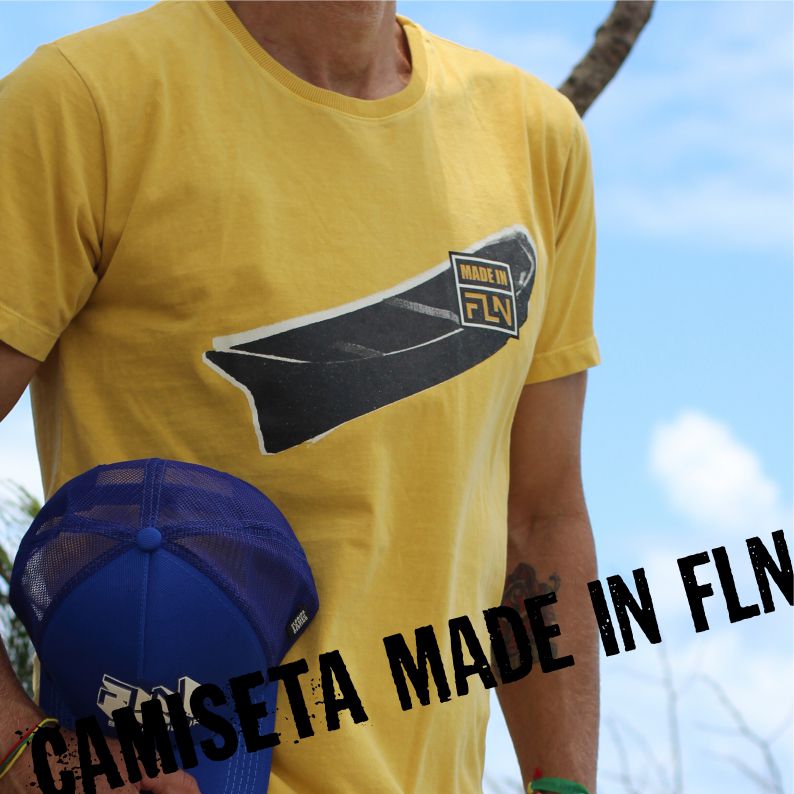 Camiseta amarela estonada modelo unissex, meia malha fio 30.1 penteado, acabamento com ombro a ombro, estampa frontal em 2 cores.