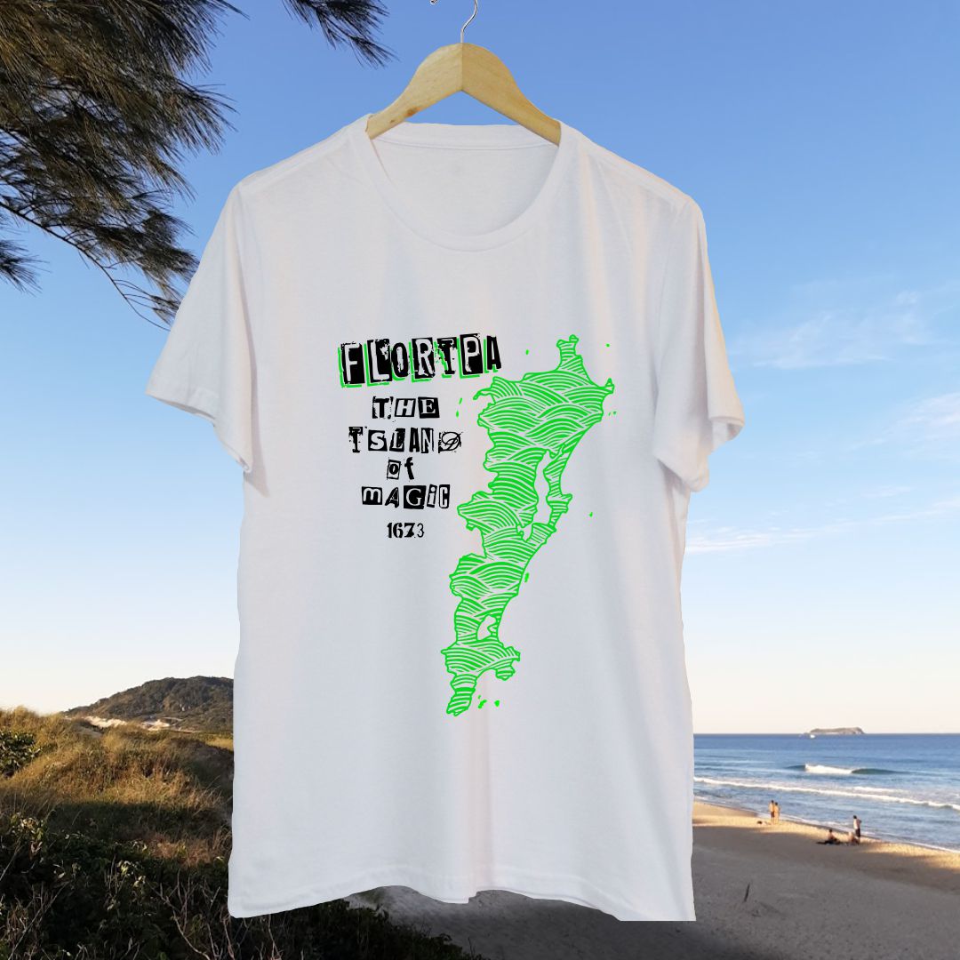 Camiseta branca, meia malha fio 30.1 penteado, acabamento com ombro a ombro, estampa frontal em 2 cores.